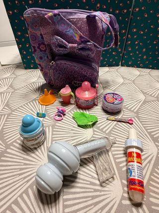 Este pack incluye varios accesorios para tus Ksi Meritos. - Mochila para accesorios Ksi Merito morado con purpurina y estampado floral. - Biberón rosa con tapa. - Biberón morado con tapa. - Chupete rosa con aro. - Embudo naranja. - Jeringuilla con vacuna para la Influenza - Jarabe para la tos - Cuchara. - Pañalito verde