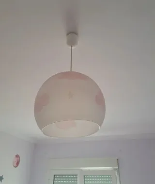 Lámpara colgante con un diseño encantador, perfecta para habitaciones infantiles. Su tono rosa suave y los detalles de nubes le dan un toque tierno y alegre. - Diseño esférico. - Adornos en forma de nubes. - Color principal: rosa pálido. - Detalle de estrella en la parte inferior.