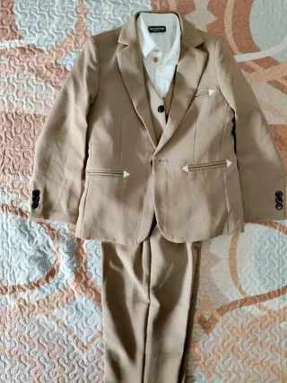 Conjunto de traje sastre para niño en color beige. Incluye chaqueta, chaleco ,pantalón y camisa - Chaqueta con solapa. - Chaleco a juego. - Pantalón de vestir. -Camisa blanca Perfecto para eventos o comuniones Talla 140,cinturilla del pantalón elastica