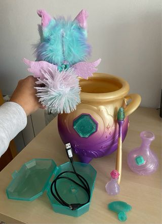 Figura de peluche interactiva Mi Pequeño Mixie. - Peluche de color azul y rosa con detalles brillantes. -Se comunica mediante varita mágica. -Ofrece modos de juego. - Incluye caldero mágico,accesorios y cargador. - Diseño con grandes ojos y cuernos. (Os faltaría recambio de pócimas) (Se venden sueltos)