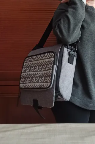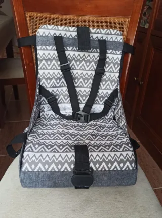 Elevador para silla de bebé con un diseño moderno y divertido. - Tejido con estampado geométrico en gris y blanco. - Cinturones de seguridad ajustables. - Hebilla de sujeción frontal.