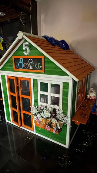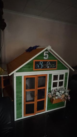 Casita de madera para niños, decorada con el número 5 y el nombre Sofía. - Puerta doble con ventanas. - Ventana lateral. - Macetero con flores decorativas. La casita infantil Masgames FLAM tiene un diseño divertido, con colores alegres y vivos, mucha luz en su interior y mucho espacio de juego. Sin duda invitará a los más pequeños a pasar horas y horas de juego en ella. La casita Masgames FLAM está fabricada de madera, y el montaje es muy sencillo. Se entrega pre montada en placas y bastará con juntar las diferentes placas entre sí para acabar formando la casita. Además viene con detalles muy cuidados como por ejemplo la jardinera