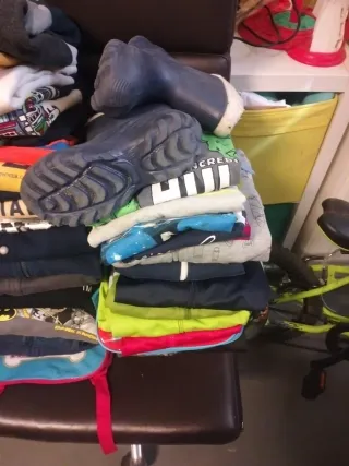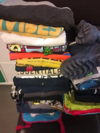 Lote de ropa para niño en varias tallas. - Incluye sudaderas 27, camisetas 5, botas de nieve 32/33, dos mochilas con etiquetas - Tallas 7, 8 y 10. #niño #sudadera #ropa