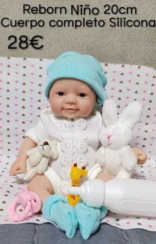 Muñeco Bebé Reborn con cuerpo completo de Silicona. Totalmente nuevo en caja de regalo. Mide 20cm. Incluye 3 peluches (conejito, osito y jirafa), biberón, chupete, mantita y certificado de nacimiento. - Cuerpo completo de silicona. - Tamaño de 20cm. - Incluye chupete y biberón.