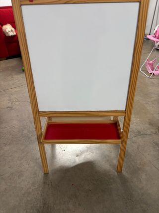 Pizarra de madera con marco de pino y bandeja roja. - Superficie blanca para escribir. - Bandeja para guardar materiales.