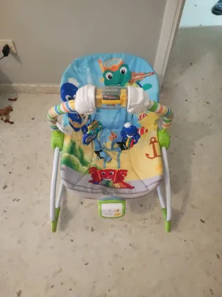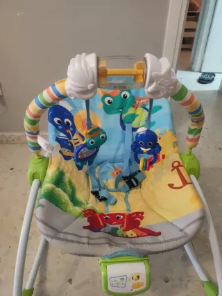 Hamaca para bebé con un alegre diseño marino, ideal para los más pequeños. Cuenta con una barra de juguetes. - Diseño con temática de animales marinos y colores vivos. -Musica y vibración - Barra de juguetes con elementos interactivos. - Estructura plegable para facilitar su almacenamiento y transporte.