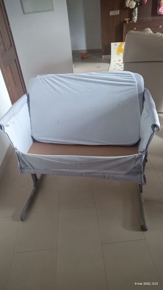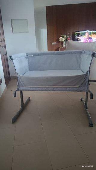Cuna colecho en buen estado, ideal para tener al bebé cerca durante la noche. - Estructura metálica. - Laterales acolchados. - Colchón incluido.
