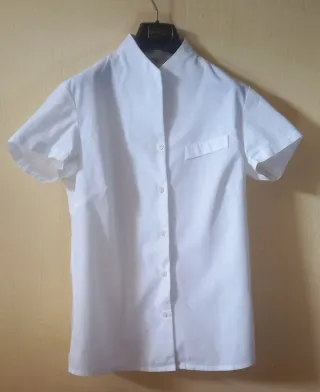 Camisa blanca de manga corta con cuello mao. Camisa de uniforme de Iberia diseñado por Adolfo Domínguez y confeccionado por El Corte inglés. Poco uso como nueva.