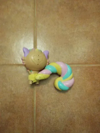 Muñeca Bellies con su característica cola de colores. - Cola en espiral con tonos pastel: rosa, azul y amarillo. - Cuerpo de la muñeca en tono beige. - Ropa de color amarillo.