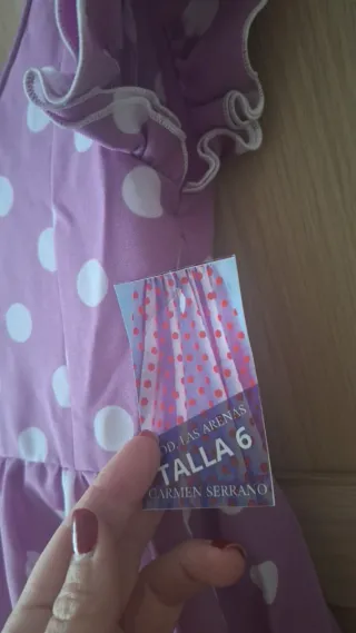 Bata de flamenca para niña (nueva a estrenar) con un bonito estampado de lunares. Talla 6, tiene bastante para sacar, adjunto fotos. - Color lila con lunares blancos. - Mangas con volantes.