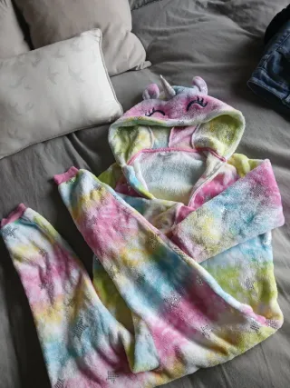 Pijama enterizo de unicornio con un divertido diseño tie-dye en tonos pastel y estrellas plateadas. Es muy suave y cómodo. - Diseño de unicornio con capucha. - Estampado tie-dye multicolor. - Detalles de estrellas brillantes.