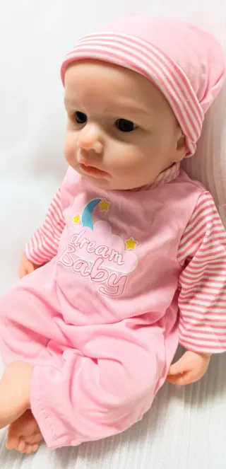 Muñeca Reborn con cuerpo completo de Silicona, completamente nueva a estrenar. Mide 30cm. - Fabricada en silicona de alta calidad. - Aspecto realista y detallado. - Incluye gorrito rosa con orejas y body blanco con dibujo de rana, biberón y certificado de nacimiento.