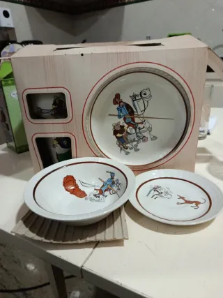 Conjunto de vajilla infantil con alegres dibujos de Don Quijote De La Mancha - Plato grande con escena de caballeros. - Bol con dibujo de caballero - Plato pequeño con escena de perro y caballo. - Dos tazas con dibujos infantiles.