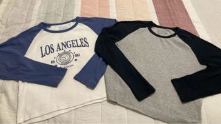 Conjunto de dos camisetas de manga larga con diseño raglán. - Una camiseta blanca con mangas y cuello azul, con estampado Los Angeles Volleyball Academy. - Una camiseta gris con mangas y cuello negro. Aunque ponga 14-15, son mas bien pequeñas, por eso he puesto como una 12. Las dos por 5€, por separado 3€ cada una.
