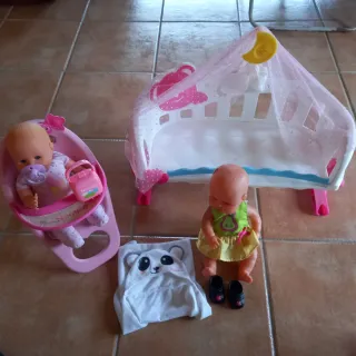 Conjunto de muñecas Nenuco con un banco con mosquitera y algunos accesorios. Incluye dos muñecas Nenuco, el banco, trono para comer, chupete con caja y ropa blanca con estampado de oso panda. Incluyo en el pack tres peluches, con bandeja para perro y otra muñeca La Nina con bolsa de viaje de regalo. Sin envíos.