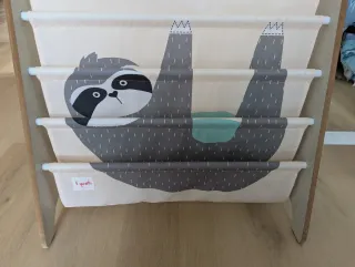 Estantería de tela con diseño de perezoso, ideal para organizar libros y juguetes. - Estructura de madera. - Bolsillos de tela con estampado. - Etiqueta de la marca '3 Sprouts'. Libreria estantería Montessori nueva