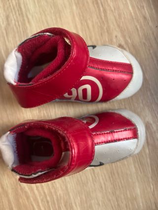 Zapatos deportivos Nike para bebé en talla 18.5. - Diseño en color rojo y blanco. - Cierre de velcro. - Detalle de número 90 en los laterales.