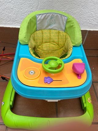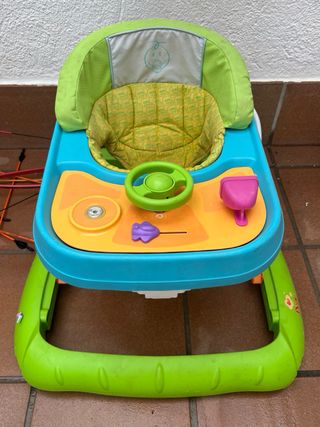 Andador para bebés con diseño de coche y centro de actividades interactivo. - Asiento acolchado. - Volante. - Juguetes integrados.