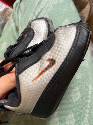 Zapatos de bebé con cordones y diseño deportivo. - Color plateado y negro. - Detalle de logo Nike en naranja. -Un poco gastadas por alante