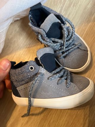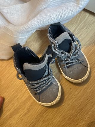 Zapatos de caña alta para bebé en color gris. - Cierre con cordones. - Detalle de tela en el cuello. - Suela blanca.