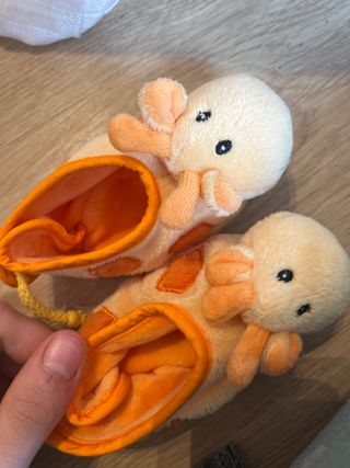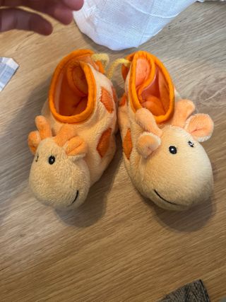 Adorable par de pantuflas de peluche para bebé con diseño de jirafa. - Suaves y cómodas para estar en casa. - Color amarillo pálido con detalles naranjas. - Forro interior naranja.