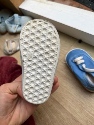 Lote de dos pares de zapatos infantiles. - Un par de zapatillas deportivas blancas y azules de la marca Reebok.Talla 17 - Un par de zapatillas tipo Converse con estampado multicolor.