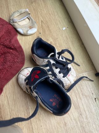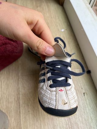 - Un par de zapatillas deportivas Adidas blancas y azules con cordones. - un poco gastadas por delante