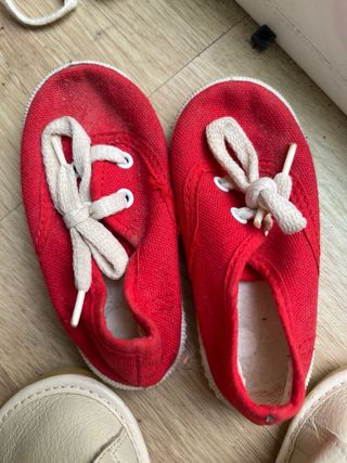 Conjunto de dos pares de zapatos para bebé. Un par es de color rojo con cordones y el otro es de color beige con detalles naranjas y cierre de velcro. - Zapatos rojos de lona con cordones. Talla 21 - Zapatos beige de piel con detalles naranjas y velcro. Talla 18 TNY
