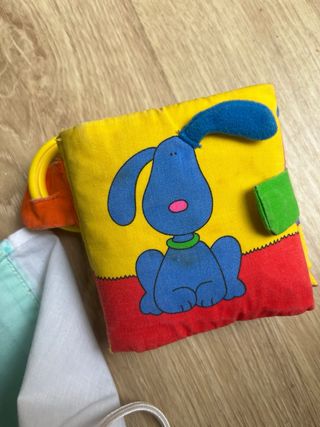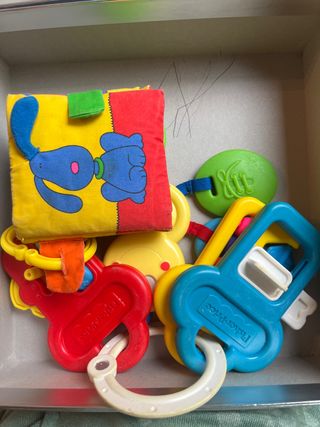 Lote de juguetes Fisher-Price para bebés, ideal para estimular sus sentidos. - Libro de tela con diferentes texturas y colores. - Sonajeros y mordedores de plástico. - Incluye un cochecito de juguete. - Diseños coloridos y atractivos.