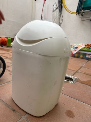 Contenedor de pañales de plástico blanco. - Tapa abatible. - Diseño cilíndrico.