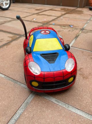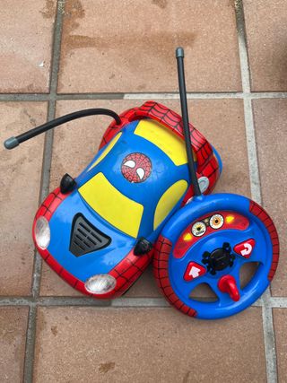 Divertido coche teledirigido con diseño de Spiderman. Incluye volante de control remoto. - Coche de color azul, amarillo y rojo. - Diseño inspirado en Spiderman con su logo. - Volante de control remoto con botones. - Antenas en el coche y en el control. - cuesta girar un poco -pilas NO incluidas