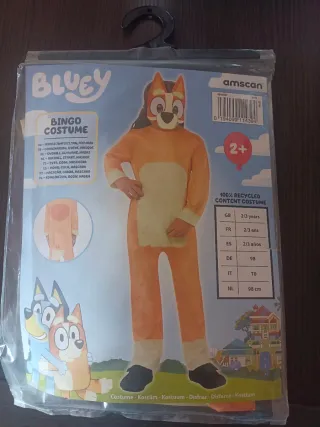 Disfraz de Bingo de la serie Bluey, perfecto para fiestas o para jugar. Incluye mono y máscara. - Talla 2/3 años. - Mono estampado con cola. - Máscara de fieltro. - Producto con 100% contenido reciclado.