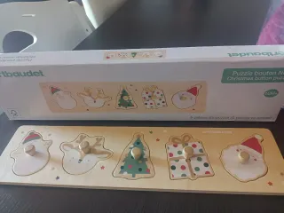 Puzzle de madera con temática navideña de la marca Vertbaudet. Incluye 5 piezas grandes con pomos para facilitar el agarre. - Diseño de personajes navideños: Papá Noel, reno, árbol de Navidad y regalo. - Material: Madera. - Edad recomendada: 10 meses en adelante.