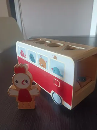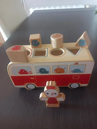Divertido puzzle de madera con forma de autobús y figuras de animales. - Incluye piezas de diferentes formas geométricas. - Diseñado para encajar las piezas en sus huecos correspondientes. - Fabricado en madera natural.