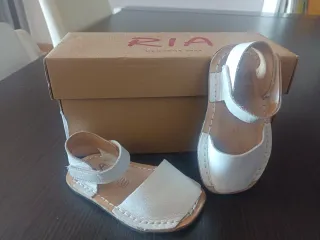 Preciosas menorquinas de la marca Ria, perfectas para los más pequeños. Son de color blanco y están hechas de piel. - Piel de alta calidad. - Cierre de velcro. - Suela flexible de goma. - Talla 21. Precio original 47 €