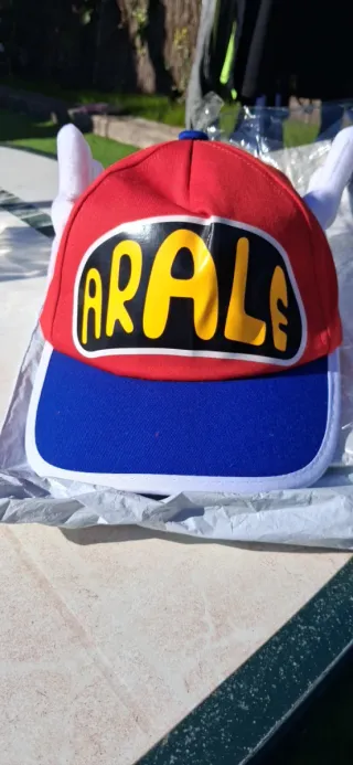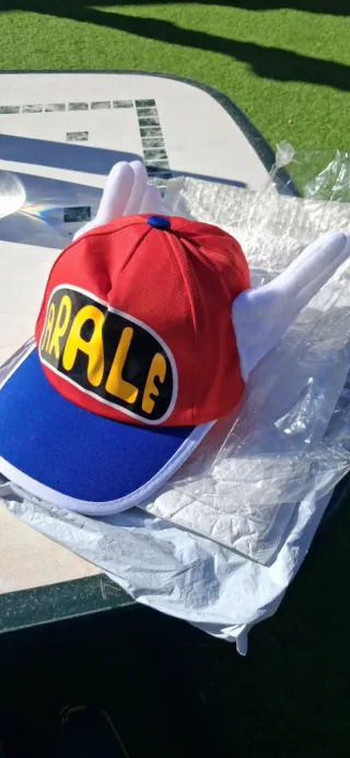 Gorra de Arale con un diseño divertido y alas. - Color rojo y azul. - Detalle de alas blancas. - Inscripción Arale en amarillo sobre fondo negro. - Nueva sin estrenar - No se ha puesto por que me llegó tarde y tube que comprar otra