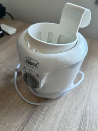 Calienta biberones de la marca Chicco en color blanco. Dispone de un selector para elegir calentar biberón o pote de comida.