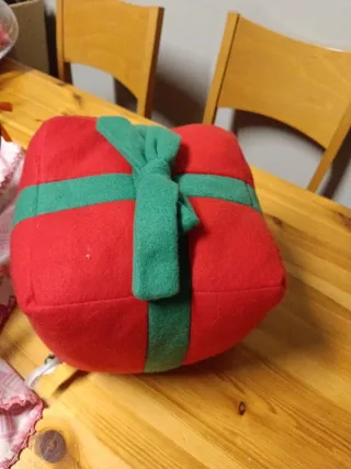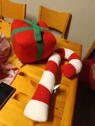 Set de dos juguetes navideños de gran tamaño. - Diseño de regalo rojo con lazo verde. - Forma de bastón de caramelo a rayas rojas y blancas. - Ambos juguetes emiten sonido.