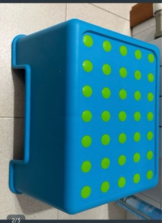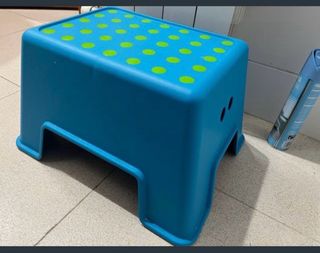 Taburete de plástico azul con un diseño divertido y práctico para niños. Ideal para alcanzar lugares altos de forma segura. - Superficie con puntos antideslizantes en color verde. - Diseño robusto y estable. - Dos asas laterales para facilitar su transporte.