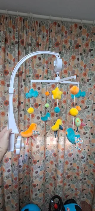 Móvil musical para cuna de la marca Bbest. Incluye varios peluches de animales y formas. - Diseño colorido con pájaros, nubes y estrellas. - Colgantes de peluche. - Mecanismo musical giratorio.