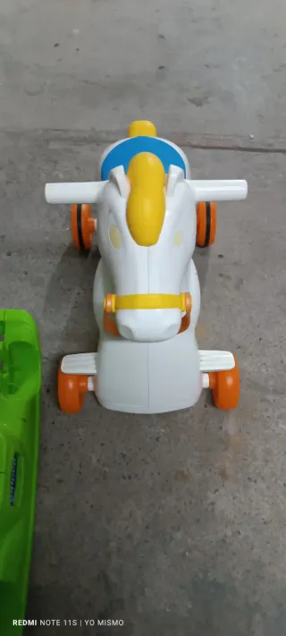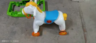 Correpasillos con diseño de caballo, ideal para los más pequeños. - Color blanco principal con detalles en azul y amarillo. - Ruedas de color naranja. - Asa de sujeción amarilla.