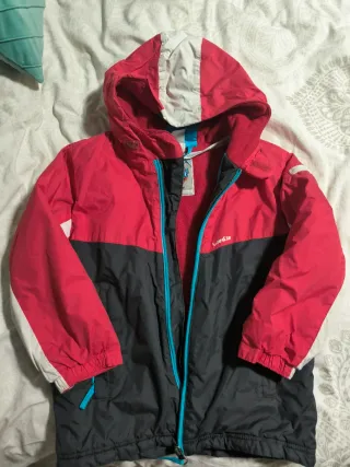 Chaqueta de nieve para niños, ideal para mantenerlos abrigados y secos. - Diseño tricolor: rosa, gris y blanco. - Cremallera frontal azul. - Capucha integrada.