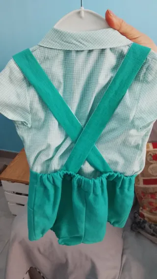 Conjunto de Mayoral para bebé, ideal para ocasiones especiales o para el día a día. La camisa es de cuadros vichy en tonos verdes y blancos, con un pequeño bordado. - Camisa de manga corta con cuello. - Bermuda a juego en color verde. - Tirantes ajustables. Escucho ofertas