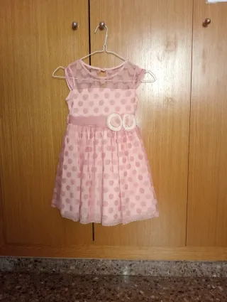 Vestido de niña en color rosa con un bonito estampado de lunares. Ideal para ocasiones especiales. - Diseño con manga corta. - Cinturón a juego con detalle. - Tejido ligero y con transparencia.