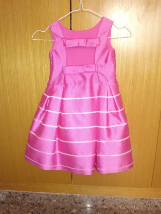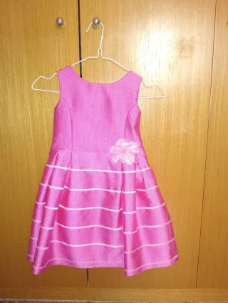 Vestido rosa para niña de 6 años, ideal para ocasiones especiales. Presenta un diseño elegante con detalles que lo hacen único. - Color rosa vibrante. - Adorno floral en el pecho. - Falda con pliegues y detalles de rayas blancas.