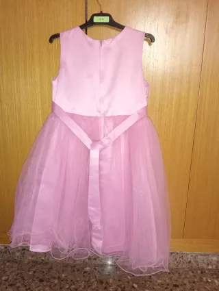 Vestido de fiesta para niña en color rosa, talla 12. Ideal para ocasiones especiales. - Cuerpo superior con encaje floral. - Cinturón de satén con lazo y detalle de pedrería. - Falda de tul con brillo.