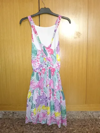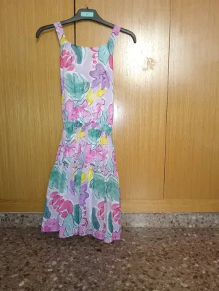 Vestido de tirantes con un alegre estampado floral sobre fondo lila. La cintura está fruncida para un mejor ajuste. - Estampado de flores y hojas. - Tirantes anchos. - Cintura elástica.