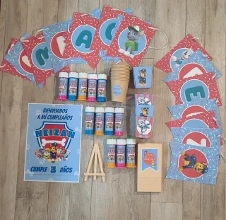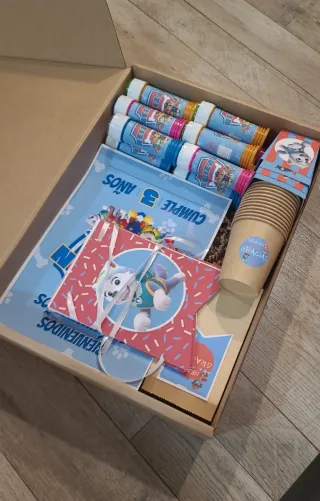 Pack de fiesta temática para celebrar un cumpleaños. - Guirnalda Feliz Cumpleaños. - Vasos de cartón. - Pomperos - Bolsita de regalo. - Cartel de bienvenida. - Pop palomitas.