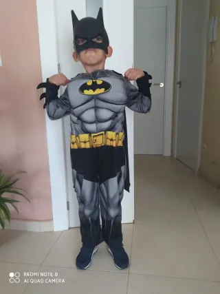 Disfraz de Batman para niños, ideal para fiestas o Halloween. Incluye todo lo necesario para transformarse en el superhéroe. - Disfraz de 3 piezas. - Incluye mono con músculos, máscara y capa. - Talla para 4/6 años.