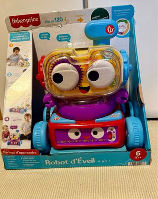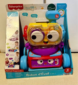 Robot de aprendizaje Fisher-Price 4 en 1, diseñado para bebés a partir de 6 meses. Fomenta el desarrollo temprano a través del juego interactivo. - Incluye más de 120 sonidos, canciones y frases. - Permite construir el robot pieza por pieza. - Ayuda a aprender el alfabeto, los números, formas y colores. - Estimula la motricidad fina y global.